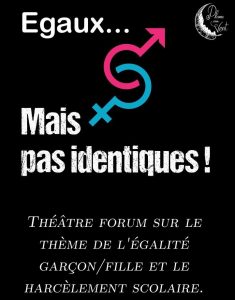 Egaux mais pas identiques est un spectacle de Théâtre-Forum destiné à la sensibilisation des adolescents aux thèmes de l’égalité garçon/fille, et à la problématique du harcèlement.